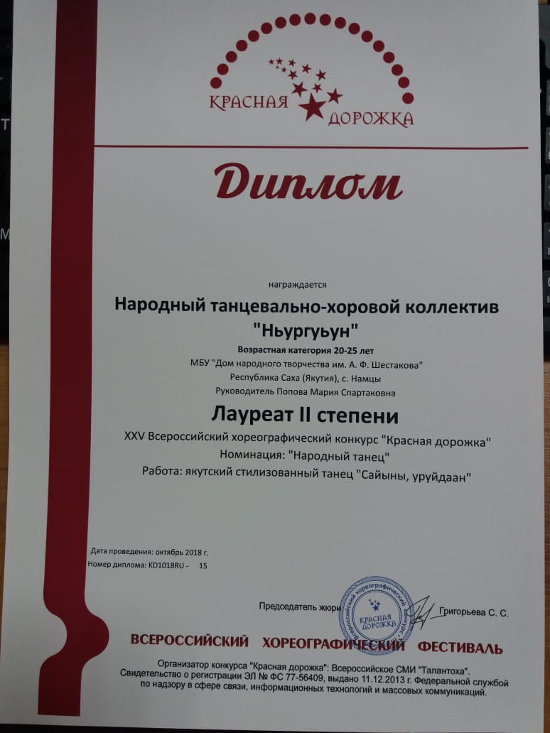 Радостная новость! Наша танцевальная  группа народного танцевально-хорового коллектива "Ньургуһун" одержала победу - лауреат 2 степени  в XXV Всероссийском хореографическом конкурсе "КРАСНАЯ ДОРОЖКА" в номинации "Народный танец" ( за исполнение якутского стилизованного танца "Сайыны уруйдаан" и дипломант 1 степени  за исполнение танца "Оҕо саас".