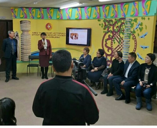 Хаартыскаҕа: М.П. Обутова-Эверстова оҕолоро, сиэннэрэ кыттыылаах выставка арыллытын кэмэ. "Нам улууһа" МТ Культура, духуобунас уонна социальнай политика управлениятын начальнига И.И. Сивцева эҕэрдэ тыл этэ турар.